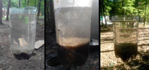 Проба воды с аерируемой емкости очистных сооружений. При нормальной работе видны коричневые хлопья активного ила (бактерий), которые через 15-30 мин осядут на дно, и будет видна прозрачная очищенная вода.